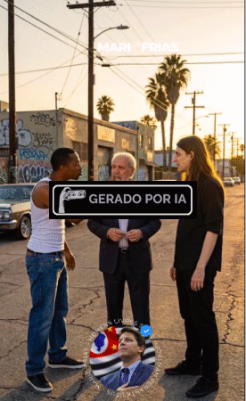 É possível perceber que se trata de um conteúdo sintético pelo aspecto plastificado e fantasioso das imagens, que simulam cenas de videogame. O parlamentar, no entanto, não sinalizou o uso da tecnologia na publicação, que serviu para desinformar sobre a lei.