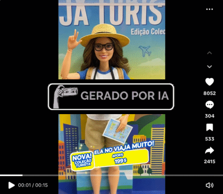 Vídeos que anunciam bonecas de Janja e Michelle Bolsonaro foram criados por inteligência artificial. Os conteúdos manipulam as imagens das primeiras-damas para satirizá-las. Um deles representa Janja como uma Barbie turista. “A boneca que passa pelo mundo todo gastando seu imposto”, diz a narração. O outro mostra uma boneca que se assemelha a Michelle Bolsonaro e acompanha celular escondido e jóias sauditas. “Micheque é a boneca mais desejada pela criança pobre de direita”, diz a narração, que também faz piadas misóginas sobre a ex-primeira dama.